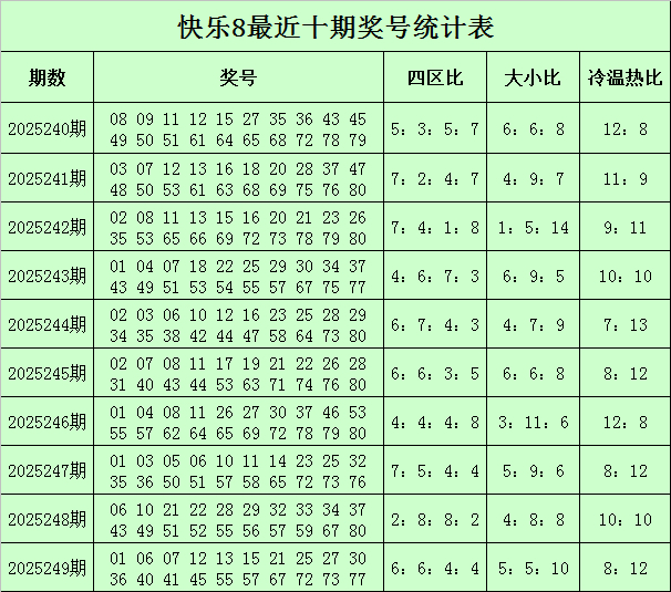 福彩赋闲8第2025249期开奖回来:01 06 07 12 13 15 21 25 27 30 36 40 41 45 55 57 67 72 73 77,其中奖号四区比为6:6:4:4,冷温热码比为5:5:10,大小比为8:12,和值为720,同尾号码为30 40、01 21 41、12 72、13 73、15 25 45 55、06 36、07 27 57 67 77。