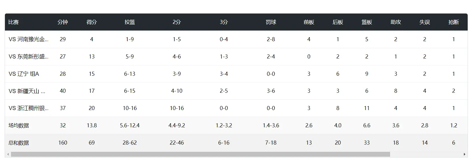 本次全锦赛是王樱霓第一次打行状联赛,她场均32分钟,拿到13.8分6.6篮板3.6助攻1.2抢断,掷中率45.1%,三分掷中率37.5%,得分排在诸暨赛区第六,篮板排在诸暨赛区第三,这位年仅19岁的小将让上海女篮贬责层容或不已。