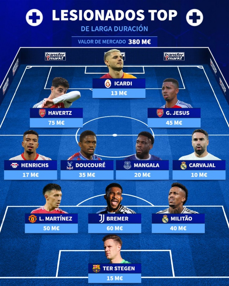 前卫:哈弗茨(阿森纳体育最新信息,7500万欧)、伊卡尔迪(加拉塔萨雷,1300万欧)、热苏斯(阿森纳,4500万欧)