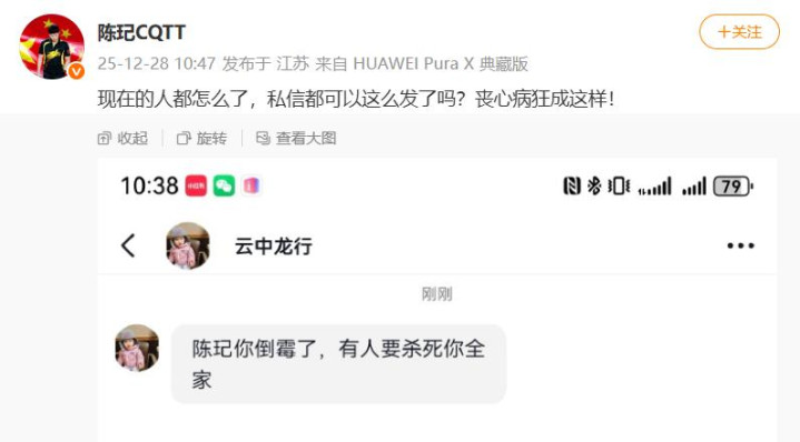 事件的中枢是一张陈玘晒出的私信截图,截图中,又名网名为“云中龙行”的用户向他发送了径直且狰狞的威逼:“陈玘你晦气了,有人要杀死你全家。”面对如斯赤裸裸的人身勒索,这位夙昔以球风凌厉、性情刚强著称,有着“杀神”外号的奥运冠军,在配文中抒发了相配的震怒与不明:“当今的人都若何了,私信都不错这样发了吗?丧心病狂成这样!”在驳倒区繁密网友“飞快报警”的命令下,陈玘的恢复“我试试”三个字,泄漏出事态的严重性与正当事人的无奈
